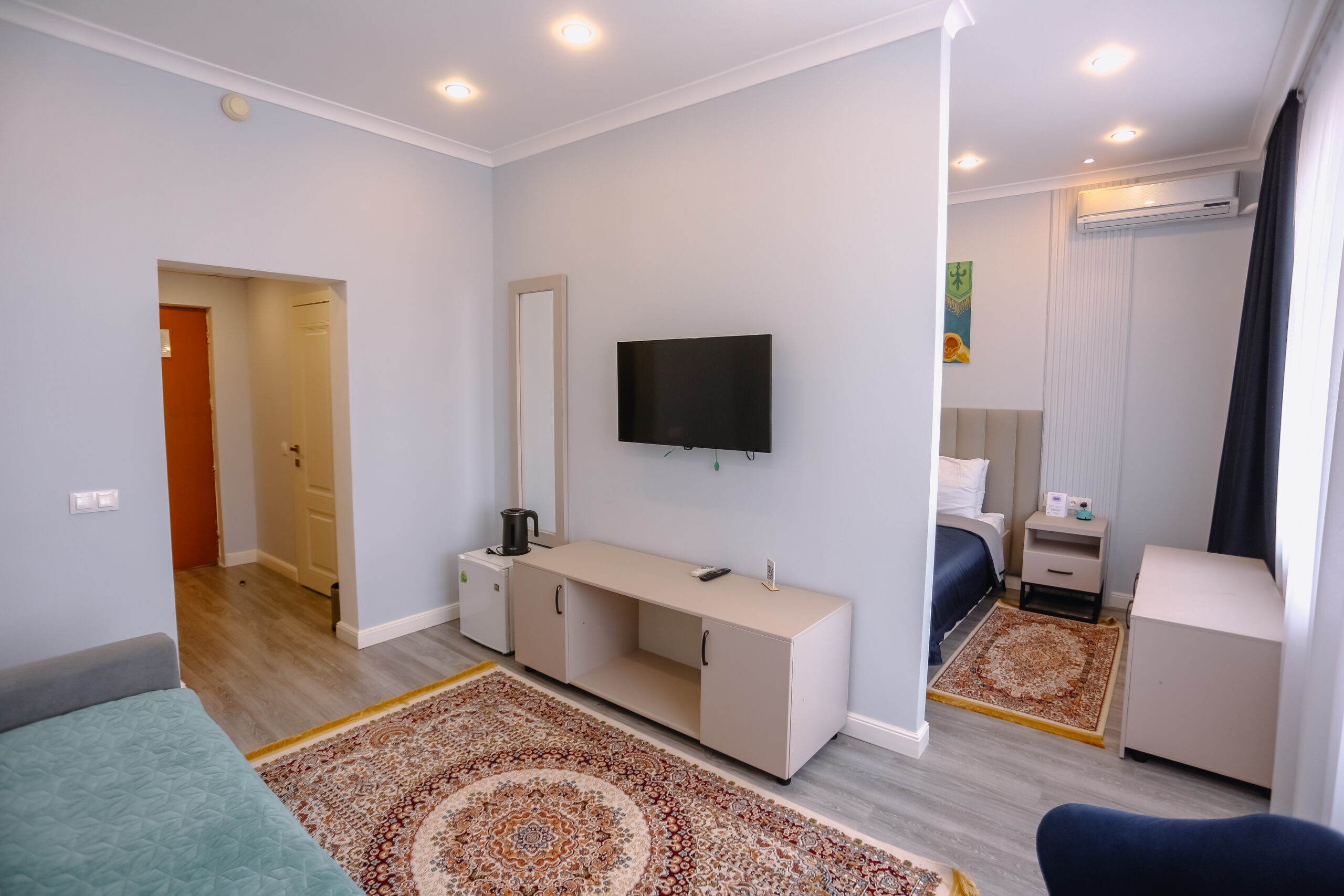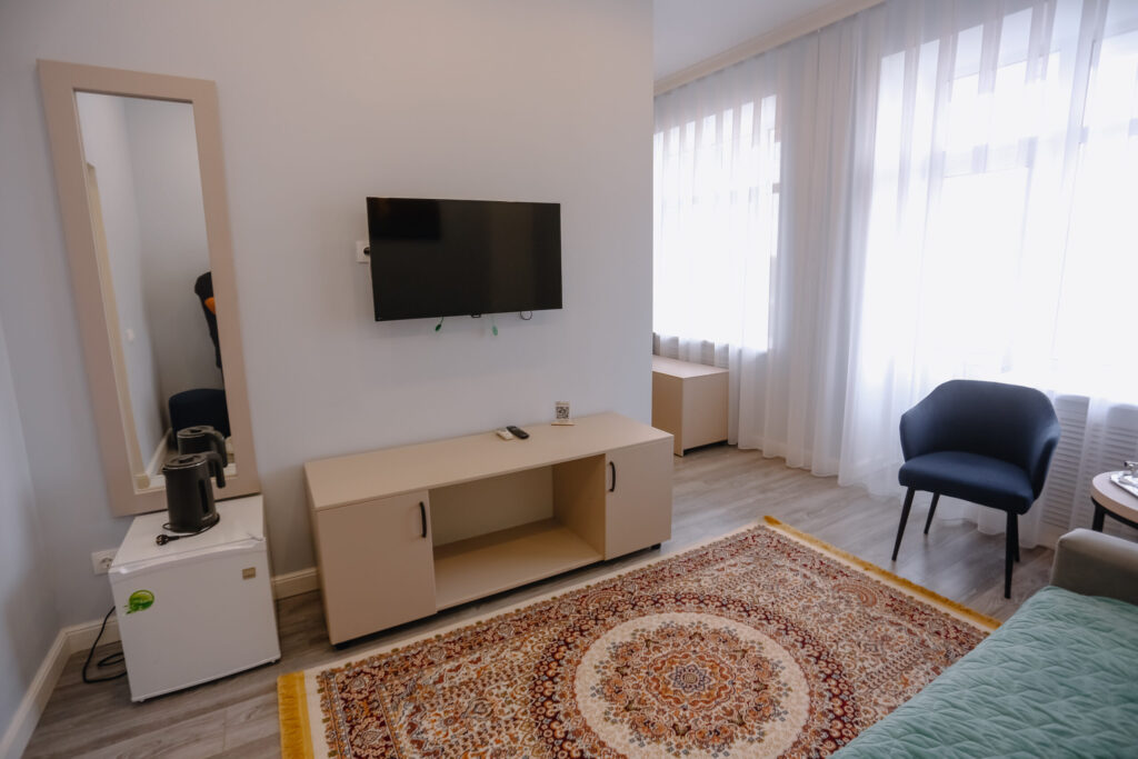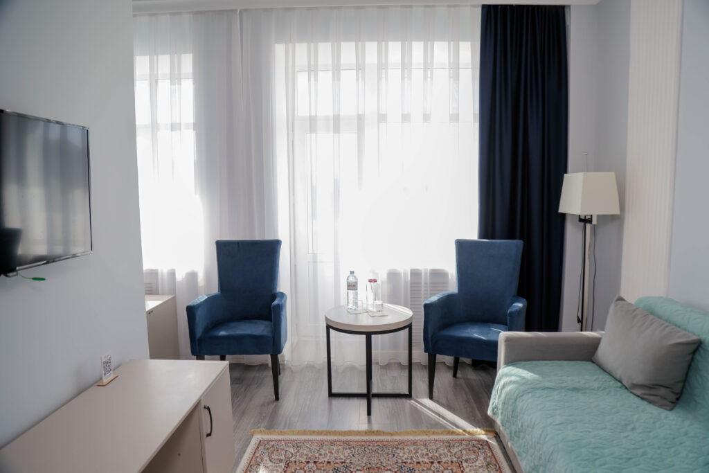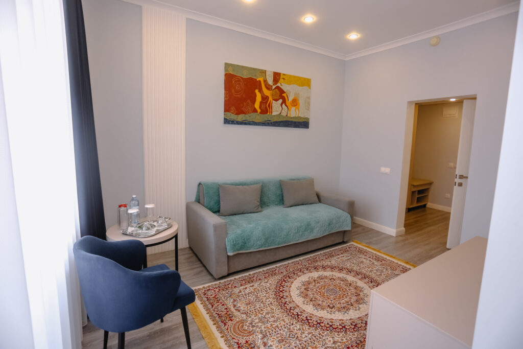 Номера класса Junior Suite имеют площадь 27,32 м2. В люксе 2, с просторными зонами спальни и гостиной, вы испытаете отличный отдых с комфортом от «Окжетпес».