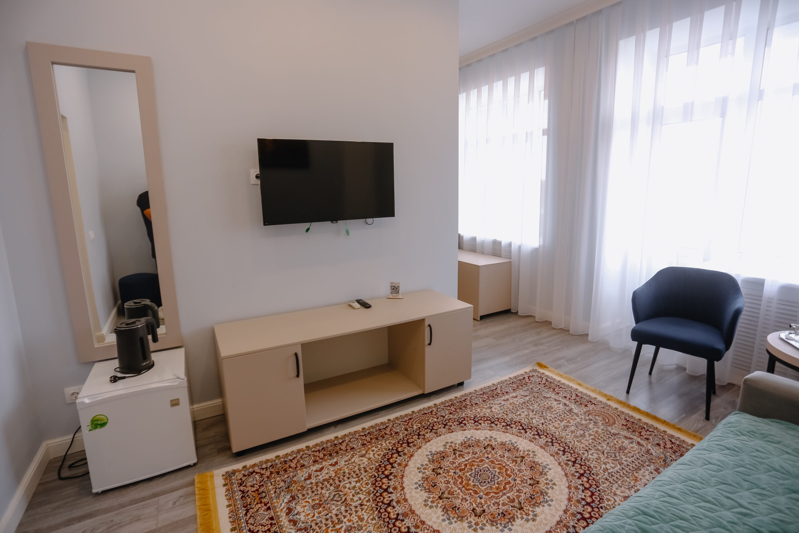 В номере имеется телевизор, Wi-Fi, наборы для чая, махровый халат и тапочки.